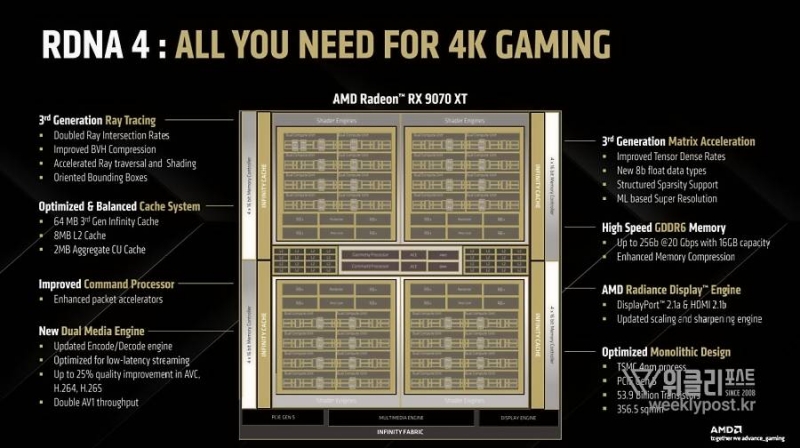 RDNA 4는 RDNA 3 대비 40% 성능이 개선됐다는 게 AMD 측 설명이다. ▲3세대 레이 트레이싱 가속기 ▲2세대 인공지능 가속기를 탑재한 부분이 주효했다.