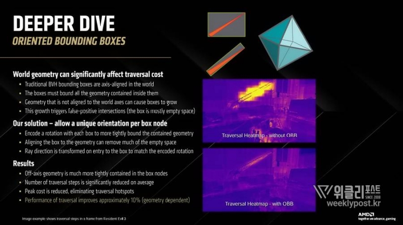 먼저 3세대 레이 트레이싱 가속기는 부족했던 게이밍 성능 향상에 큰 도움을 준다. 광선 추적(레이 트레이싱) 기술은 광원을 실시간 처리하는 방식 때문에 GPU에 큰 부하를 준다. 어떻게 효율적인 형태로 광원을 처리하는지 여부가 성능을 좌우할 수밖에 없다. RDNA 4 아키텍처는 박스당 8 광원, 삼각형 유닛당 2 광원 연산을 지원한다. RDNA 3 대비 2배 향상된 수치다. 변환 작업도 셰이더가 아닌 레이 트레이싱 가속기에서 직접 수행하므로 효율 또한 개선됐다.