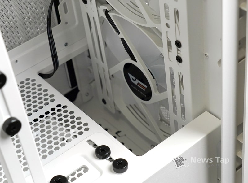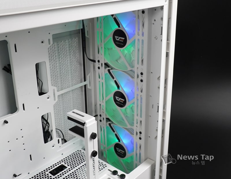 참고로 'darkFlash DLX21 RGB MESH 강화유리'는 이번 3차 업그레이드를 통해 먼지 필터의 탈부착 방식과 위치를 변경했다. 하단부에 자리 잡은 슬라이딩 먼지 필터를 탈부착이 편리한 타입으로 교체해 편의성을 높였다. 또 전면 먼지 필터의 위치를 베젤 프레임 사이로 변경해 최대 27mm 두께의 쿨링 팬을 장착할 수 있게 됐다.