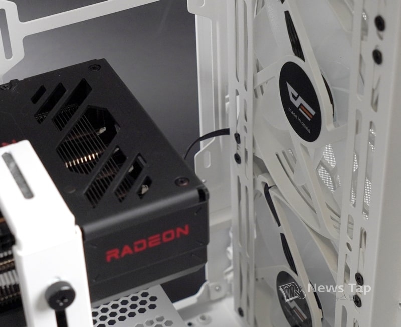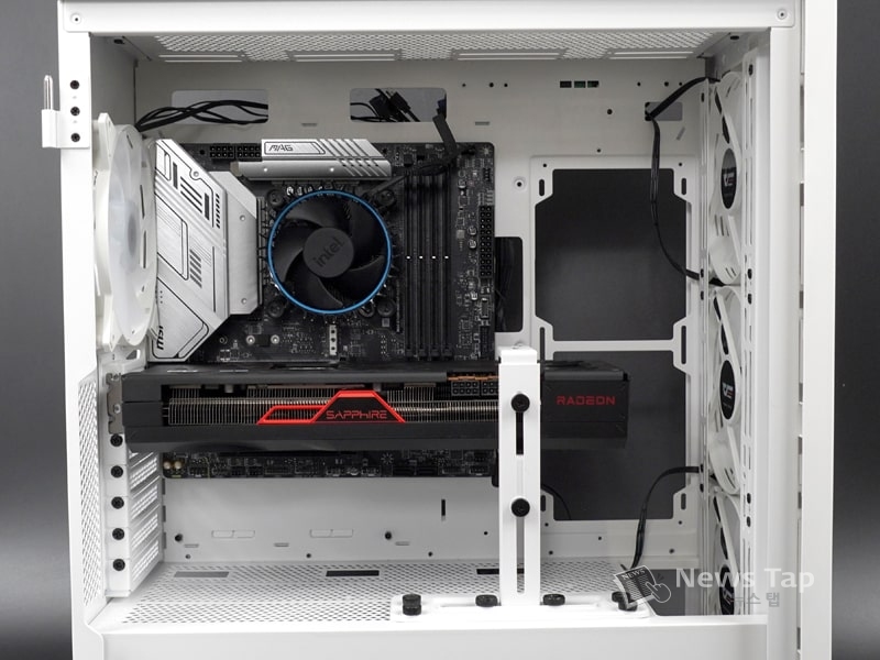 실제로 길이가 320mm에 달하는 그래픽카드도 무리 없이 장착이 가능하다는 것을 확인할 수 있었다. 최근 출시된 3팬의 'SAPPHIRE 라데온 RX 7900 GRE PULSE D6 16GB'를 탑재한 결과 여유 공간이 충분한 것을 볼 수 있다. 하이엔드 그래픽카드를 사용하고자 하는 유저들에게 좋은 소식이다.