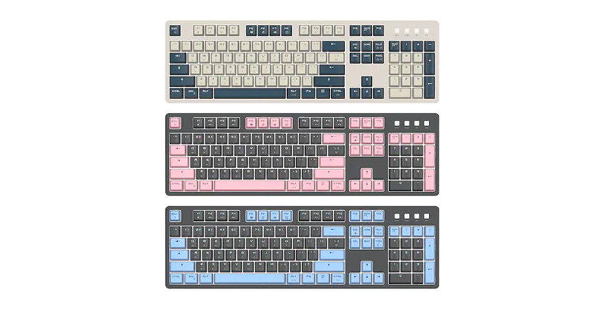 본격적으로 마이크로닉스 WIZMAX W101P 키보드를 살펴보면, 일단 색상은 피코크 그린/스카이 블루/애쉬 핑크 총 3가지 컬러로 출시되었으며, 하우징과 키캡 색상으로 구분됩니다. 특히, 피코크 그린 같은경우에는 베이지색 계열이라 다른 색상에 비해 레트로 감성도 줍니다. 이 외에 104 키의 전형적인 풀-배열과 키보드 케이스 한쪽에 WIZMAX 로고를 확인할 수 있으며, 숫자키패드 위에는 2022년부터 마이크로닉스가 직접 개발한 3D 디자인의 LED 인디케이터를 확인할 수 있죠.