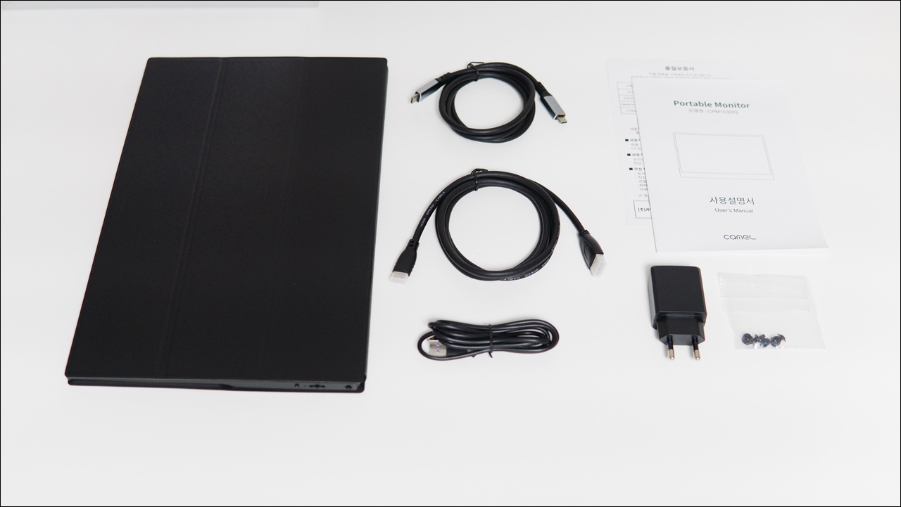 구성품부터 살펴보면 카멜 프리즘 보조 모니터(QHD 해상도) 본품, 전용 커버, 전원 어댑터, USB-C to A 케이블(1.5m), USB-C to C 케이블(1m), HDMI to Mini HDMI 케이블(1.5m), 사용자 설명서가 포함되어 있습니다. 기본적으로 다양한 케이블이 포함되어 있어서 따로 구매할 필요 없어 다양한 기기들과 연결해 바로 사용할 수 있어요.