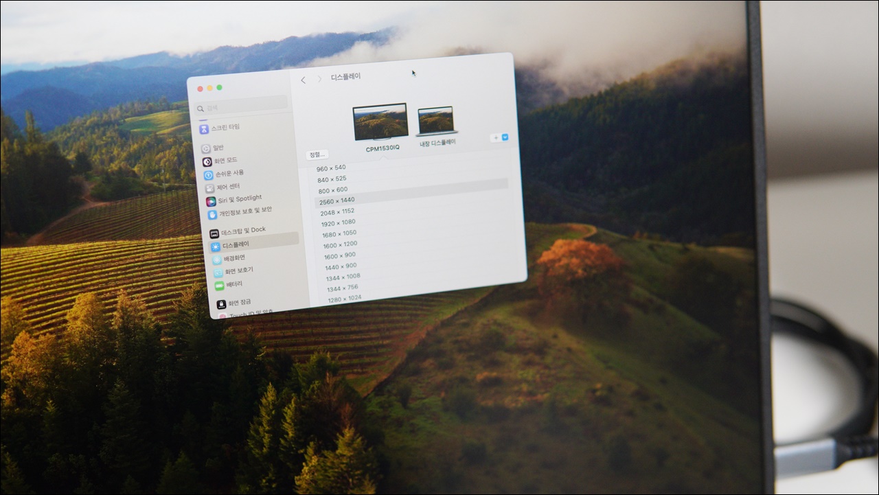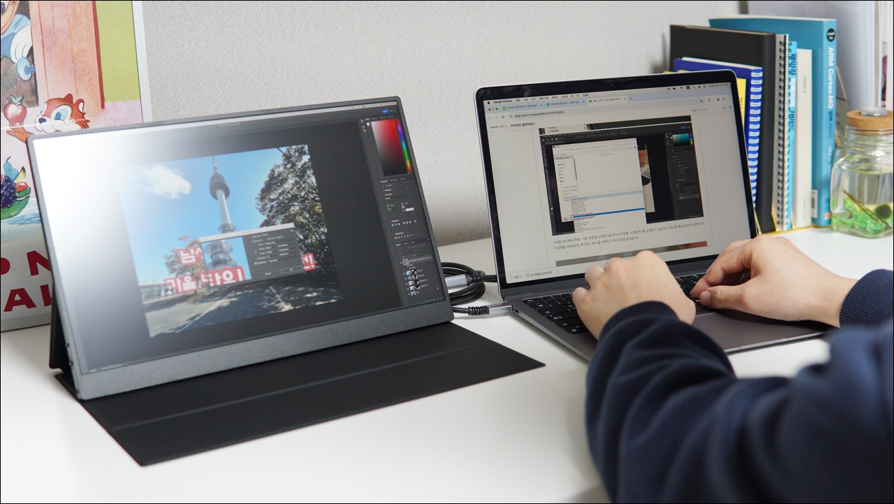 먼저 맥북 에어 13인치를 USB-C 포트로 연결해 봤습니다. 따로 전원을 연결하지 않아도 바로 보조 모니터로 사용할 수 있어요. 15.6인치 화면 크기 덕분에 다양한 프로그램을 띄워 놓으며 멀티태스킹이 훨씬 편해졌습니다. 공간도 크게 차지 않으면서 생산성이 크게 향상되어 좋더라고요.