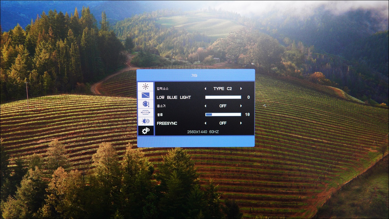 다이얼 버튼을 통해 화면 설정도 가능한데요. 위로 올리면 밝기, 아래로 내리면 볼륨을 빠르게 조정할 수 있고, 꾹 누르면 OSD 메뉴를 불러올 수 있습니다. 밝기 외에도 블랙 레벨, 명암, 사용모드, 동적명암비, 선명도, 고정 종횡비, 색온도, HDR 모드, 프리싱크 등 실제 모니터 못지않게 세세하게 조정 가능해서 놀랐던 부분이에요.