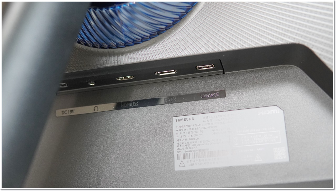 후면 입출력 포트를 살펴보면, 아래에서 위로 케이블이 꽂아지도록 위치하고 있어 깔끔한 모습이에요. 다양한 제품 연결을 위해 DP 1.2 포트, HDMI 1.4 포트, 헤드폰 단자, SERVICE USB-A 포트가 들어갔습니다. 메인 컴퓨터 외에도 플스, 엑스박스 등 콘솔 게임기를 32인치 모니터에 상시로 연결해두고 쓸 수 있어요.