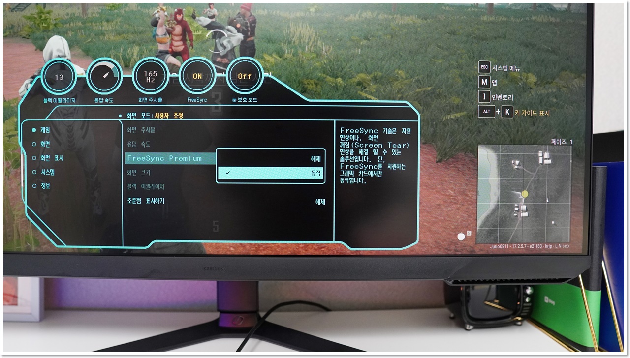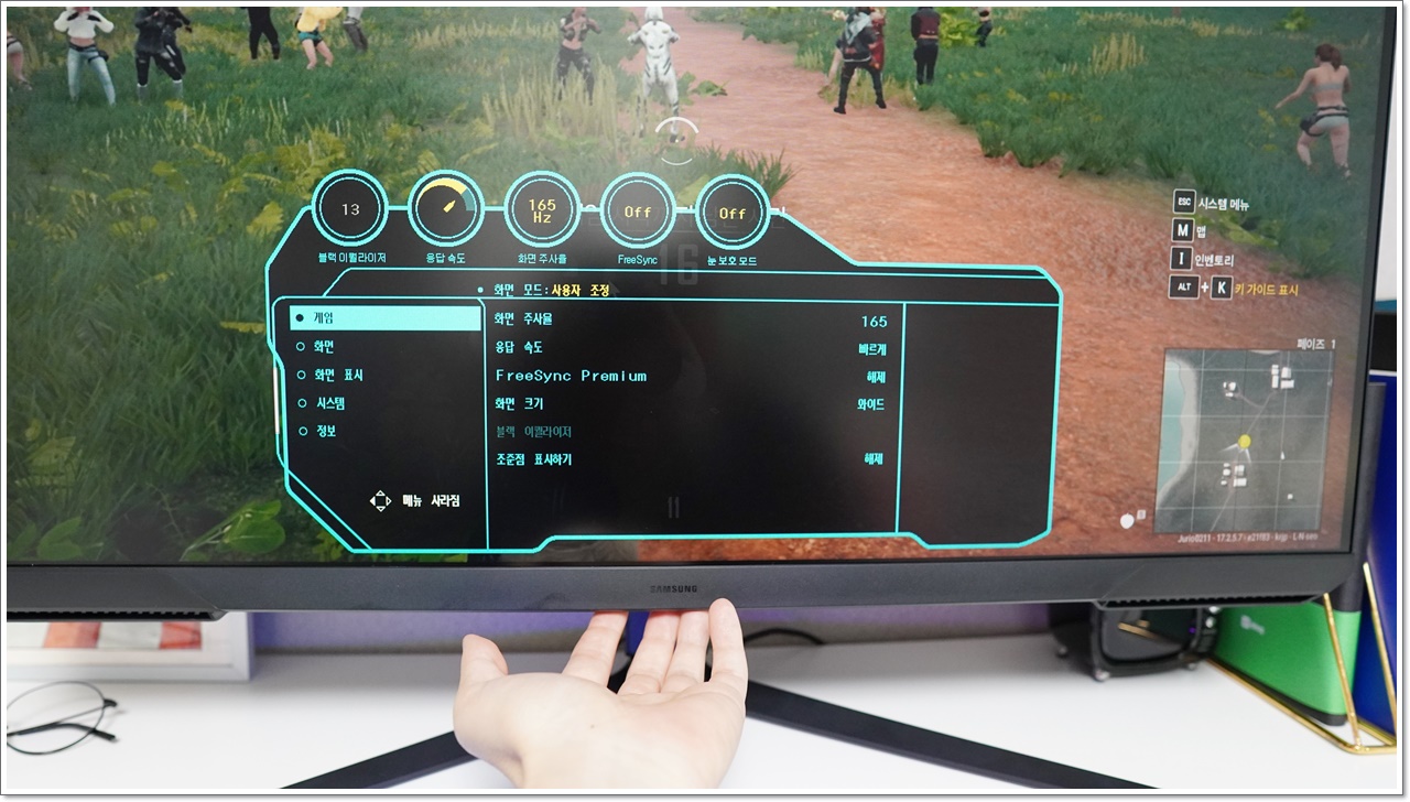 만약 컴퓨터와 플스에서 표시가 안된다면, 제품 하단의 버튼을 눌러 OSD 보드로 들어갑니다. OSD 보드 게임 설정을 보면 화면 주사율, 응답 속도, FreeSync Premium, 화면크기, 블랙 이퀄라이저, 조준점 표시하기 등 다양한 설정이 가능해요. 여기서 주사율이 제대로 설정되어 있는 확인해야 해요.