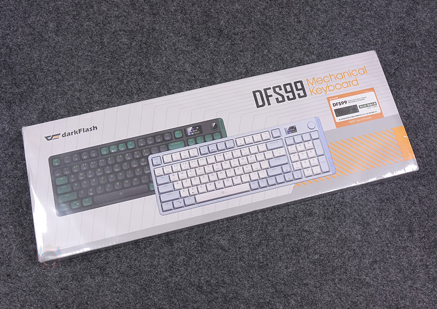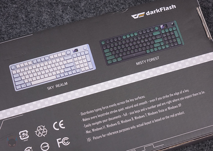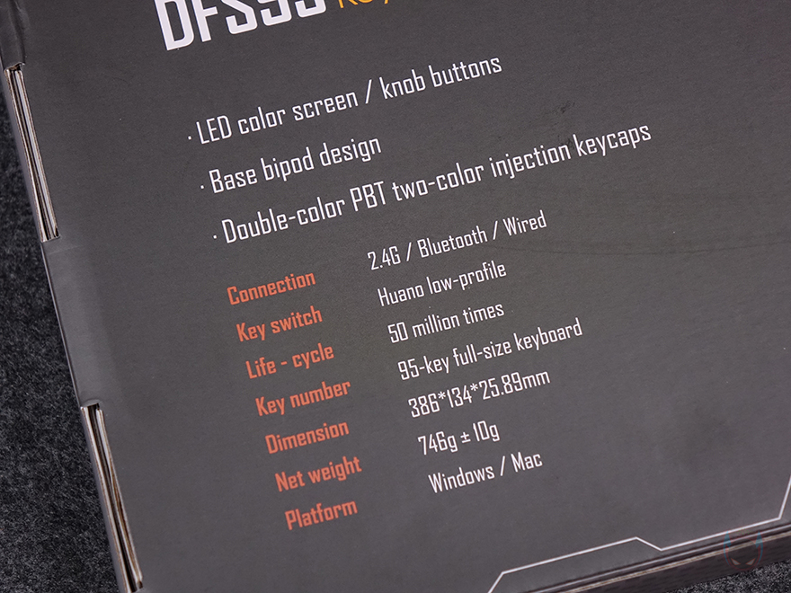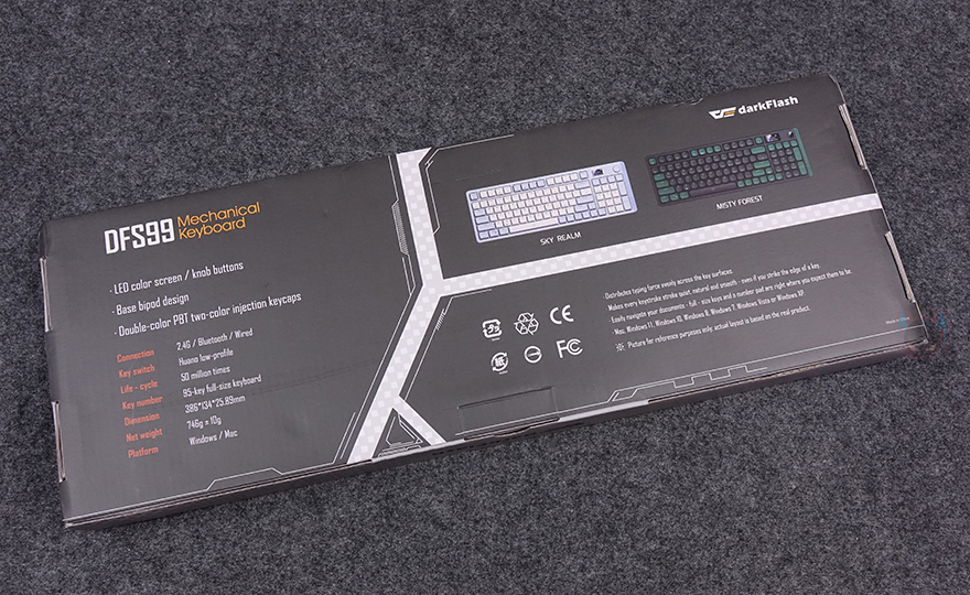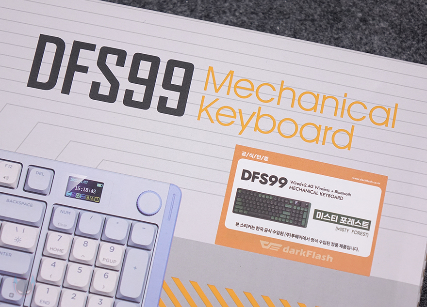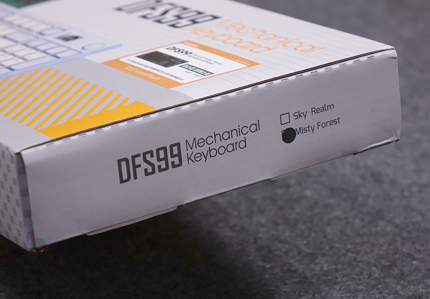 제품 박스부터 살펴보면, 먼저 출시했던 DF98 모델과 마찬가지로 DFS99 역시 박스 전체가 비닐 밀봉처리되어 있습니다. 소비자입장에선 판매 제품에 좀 더 신뢰를 가질 수 있는 패키지 형태라 할 수 있죠. 그리고, 박스 전면에는 제품 이미지를 담고 있는데, 역시 DF98과 마찬가지로 DFS99 키보드도 2가지 컬러로 출시되었다라는 걸 쉽게 알 수 있고, 모델명과 함께 색상 구분 표기를 스티커와 박스 측면에서 확인할 수 있습니다. 물론, 박스 후면에서도 풀샷 이미지와 함께 한 번 더 확인할 수 있으며, 색상에 따라 미스티 포레스트, 스카이 렐름으로 명칭하고 있습니다. 그리고, 후면 왼쪽에는 주요 특징과 제품의 기본 사양을 표기해 놨는데, LED 스크린/노브 버튼, 기본 바이포드 디자인, 이중사출 PBT 키캡을 언급하고 있죠. 그리고, 뒤에서 다시 확인하겠지만, 기본 사양표기에 스위치 제조사도 정확히 표기하고 있습니다.