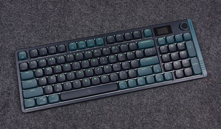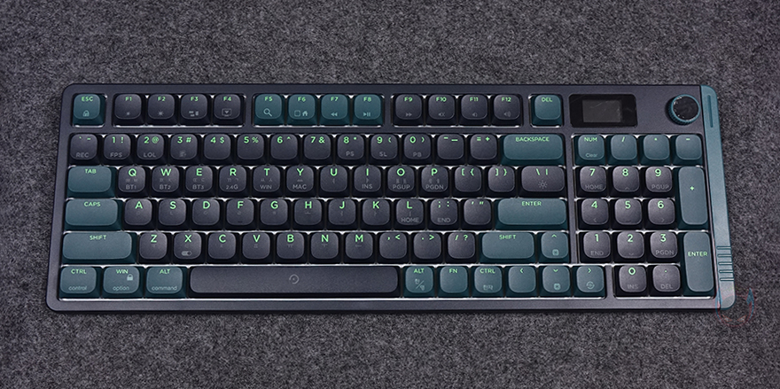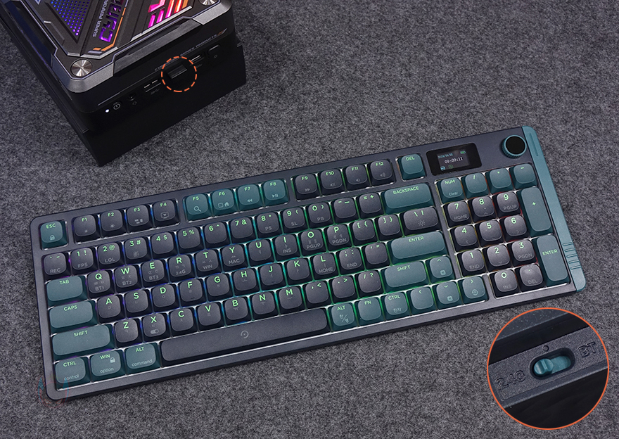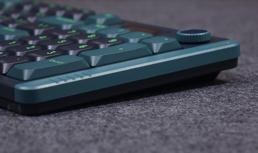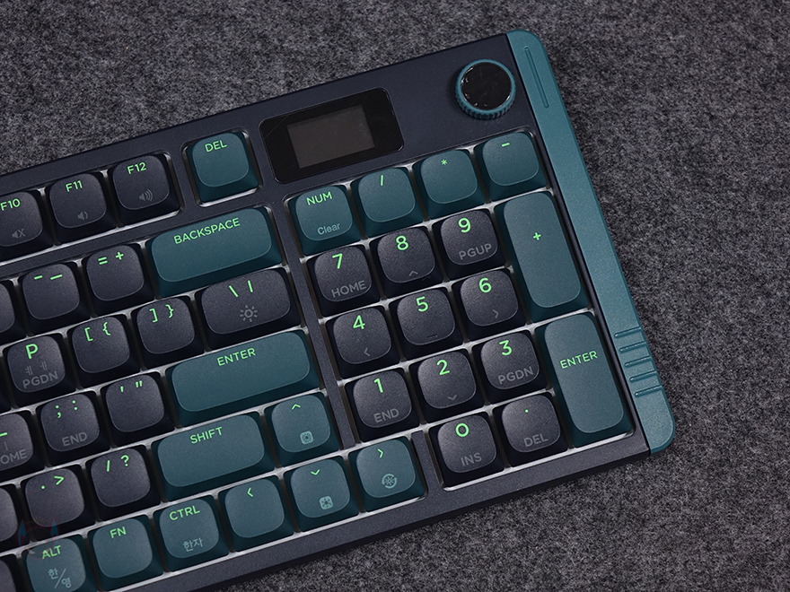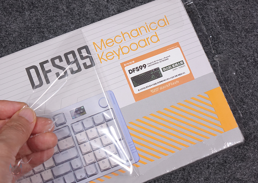 좀 더 자세하 살펴보면, 총 키 수는 95키로 요즘 트렌드인 풀-배열 104 키의 핵심이 숫자키패드와 방향키는 유지하면서 특수키를 줄여 키보드 사이즈를 줄인 형태입니다. 그래서, 키보드 오른쪽에 그 특성을 그대로 담고 있죠. 또한, 숫자 키패드 위에는 LCD 디스플레이와 다이얼 노브가 배치되어 있는데, 앞서 제품 박스에선 LED 스크린, 노브 버튼이라고 표기하고 있었죠. 좀 더 정확한 표현은 LCD 디스플레이와 다이얼 노브가 맞습니다. 화면 크기는 1.06인치이며, 디스플레이와 노브 모두 개봉 시에는 보호비닐이 부착되어 있죠. 뒤에서 확인하겠지만, 디스플레이가 적용된 다른 키보드 제품들처럼 DFS99도 LCD 디스플레이를 통해 연결상태, 기능 활성화 유무, 배터리 잔량, 날짜와 시간 등을 확인할 수 있습니다.
