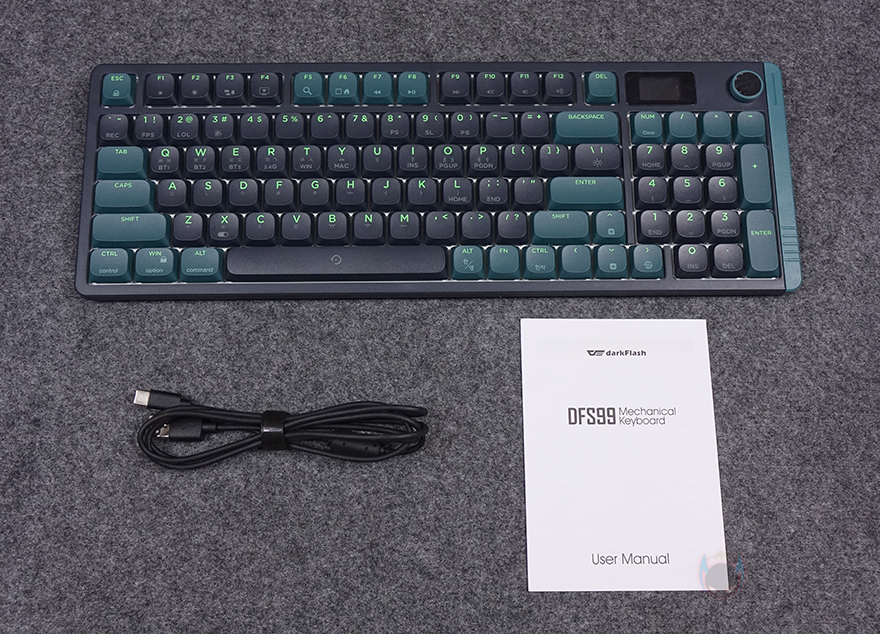 박스를 열어보면, 키보드는 기본 비닐포장이 되어있으며, 외부 충격방지를 위해 우레탄-폼 포장재를 함께 사용했으며, 제품 구성은 DFS99 키보드, USB 전원 및 충전케이블, 제품설명서로 간단합니다. 뒤에서 확인하겠지만, 슬림한 형태의 키보드이기 때문에 키캡 및 스위치 리무버 같은 도구는 제공되지 않죠.