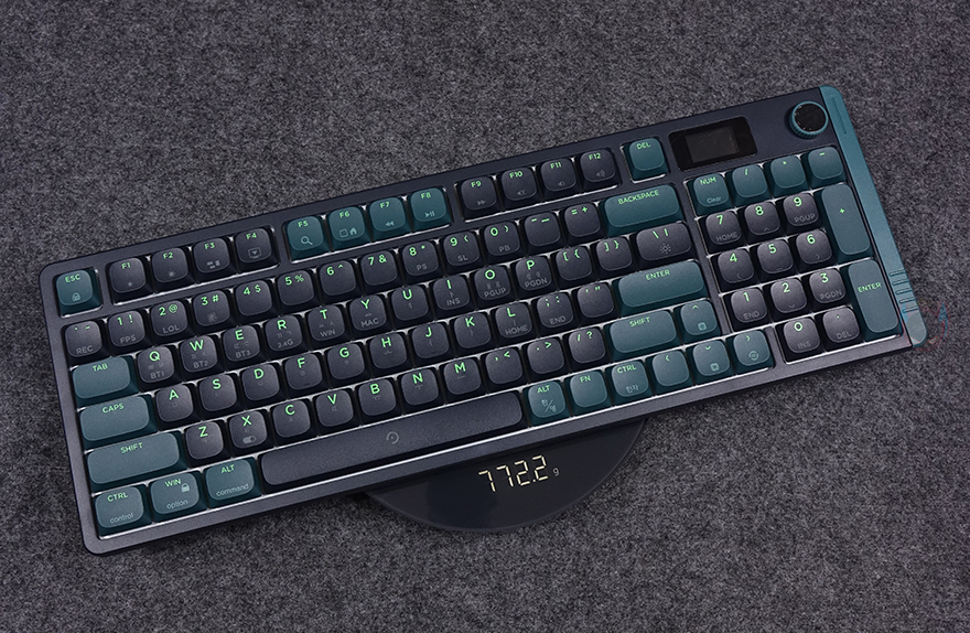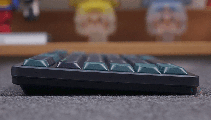 본격적으로 다크플래쉬 DFS99 키보드를 살펴보면, 제품 박스에서 미리 언급했듯이 색상에 따라 제품은 2가지 구분되는데, 2가지 제품 모두 투톤 컬러를 가지고 있죠. 블랙과 청록색 조합의 모델은 '미스티 포레스트'라 부르고, 화이트와 블루 색상 조합의 모델은 '스카이 렐름'이라고 부릅니다. 화이트와 블루 색상 조합은 다른 키보드에서 흔히 볼 수 있는 무난한 컬러 조합이고, 블랙과 청록색은 키보드에선 보기 드문 조합이라 신선하다 할 수 있습니다. 그리고, 키보드 무게는 약 772g이며, 측면에서 키보드 높이와 키캡 높이가 낮은 슬림형태의 키보드라는 걸 알 수 있습니다. 참고로, 스펙상으로는 약 26mm 두께라고 표기하고 있죠.