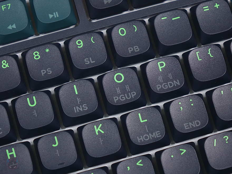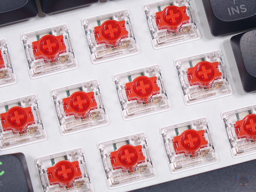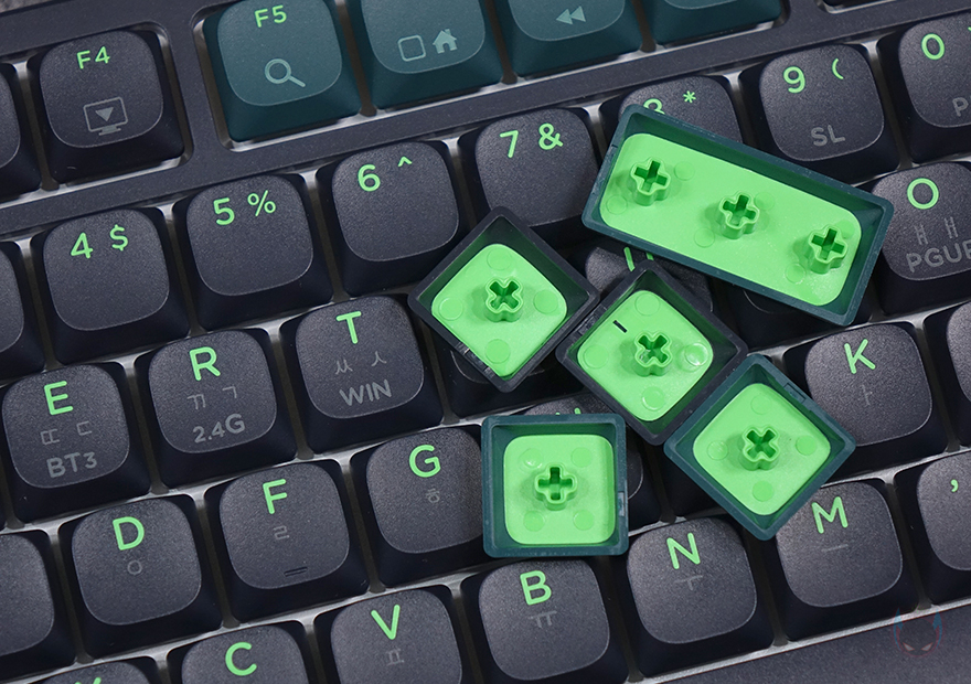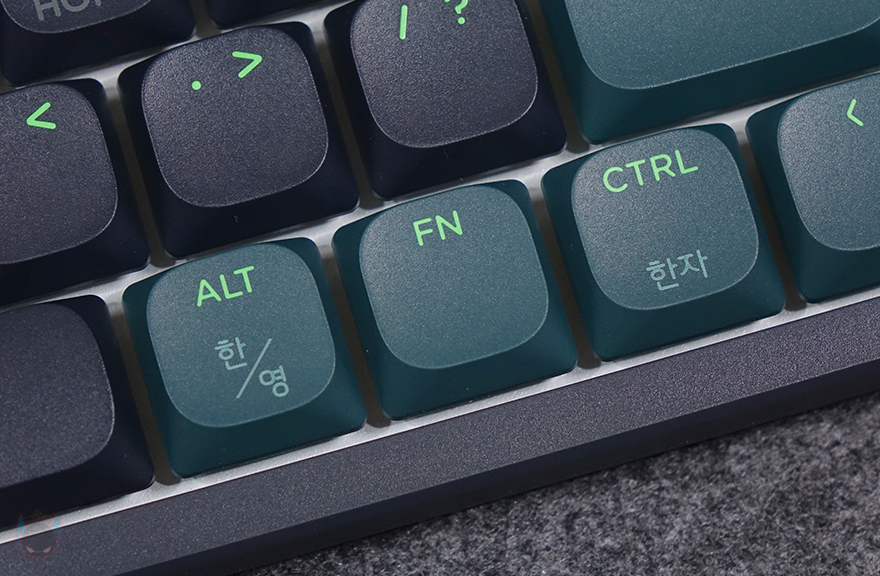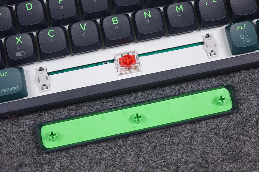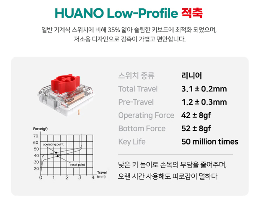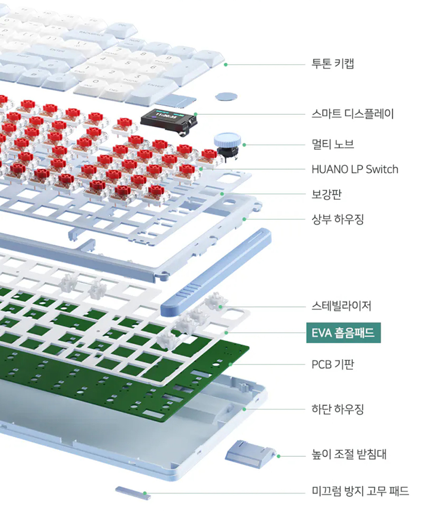 키캡은 로우 프로파일 스위치가 적용되었기 때문에, 일반 키캡보다 낮은 키캡을 사용했으며, 낮은 키캡임에도 PBT 재질에 이중사출 방식을 적용했습니다. 영문과 기호 부분이 여기에 해당되고, 한글과 부가기능 표시는 인쇄로 처리되어 있습니다. 스위치는 로우 프로파일 스위치로 제조사는 후아노(HUANO)이며, 일반 스위치보다 35% 높이가 낮기 때문에 기본적으로 소음이 작을 수밖에 없는데, 스위치 타입도 리니어 적축이라 더 소음이 작다할 수 있습니다. 여기에 제품 상세페이지에서 제공하는 제품 구조까지 참고해 보면, 슬림한 두께를 가졌음에도 흡음패드까지 적용된 것을 알 수 있죠. 그리고, 스위치 안쪽 PCB 기판 부분에는 RGB LED도 적용되어 있으며, 스페이스-바 같은 긴 키들의 스테빌라이저는 체리식입니다.