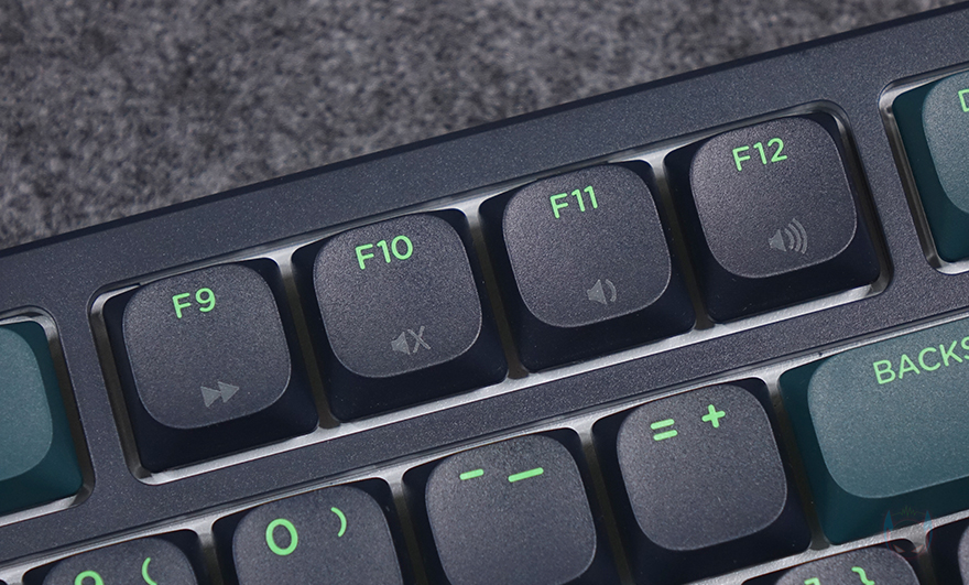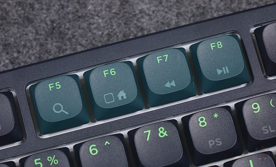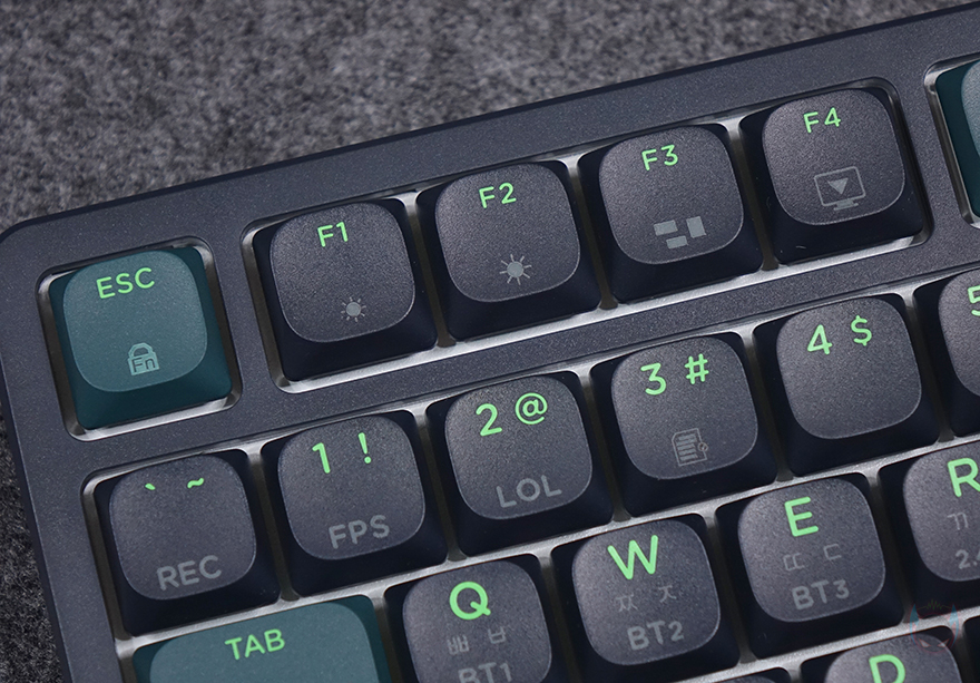 DFS99 키보드 역시 트렌드에 따라 그리고 표준적 배열은 아니기 때문에 Fn키 조합으로 부가기능들을 지원하고 있습니다. 일단, RGB 백라이트도 지원하는데, Fn+\ 조합으로 모드 변경을 할 수 있으며, 상하좌우 방향키 조합으로 각각 밝기조절과 방향 조정, 색상 조정을 할 수 있습니다. 그리고, 숫자키 1/2/3을 통해서 특정 LED 모드로 전환할 수 있고, ~키 조합으로 커스텀 적용도 가능하죠. 숫자 키 위에는 Fn 잠금해제를 할 수 있는 ESC키 조합을 비롯해, F1~F2키는 화면밝기조절, F3키는 Alt-Tab, F4키는 Win+Tab 기능을 가지고 있으며, F5키 조합으로 검색, F6키는 웹브라우저, F7~F9키는 미디어 재생 컨트롤, F10~F12키 조합으로는 음소거 및 볼륨조절 기능을 가지고 있습니다. 물론, 이건 윈도우 자판 기준이고, DFS99는 Fn+T키와 Y키 조합으로 각각 윈도우와 맥(Mac) 자판 레이아웃으로도 전환할 수 있기 때문에, F숫자키 조합 일부는 기능이 다를 수 있습니다. 그래서, 설명서를 한 번쯤 참고하면 좋고, 이밖에 숫자 8/9/0 키부터 아래로는 95 키 배열에서 제외된 특수키 기능을 사용할 수 있으며, Q/W/E/R 키 조합으로 블루투스 디바이스와 무선 2.4G 연결 모드, X키 조합으로 백라이트 On/Off, -와 =키 조합으로 백라이트 속도조절을 할 수 있으며, 공장초기화는 스페이스 키 조합으로 3초 이상 누르면 됩니다. 참고로, 부가기능을 가진 키들은 모두 자판에 표기가 되어 있습니다.