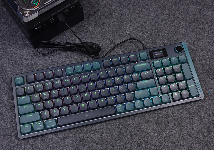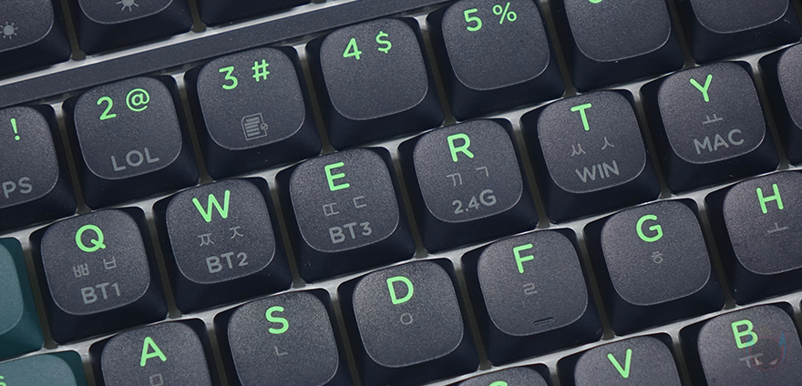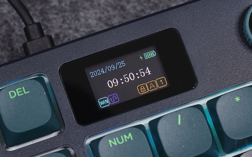 그리고, 키보드에 전원이 들어오면, 숫자키패드 위에 배치된 LCD 디스플레이 화면도 함께 켜지는데, 다크플래쉬 로고 부팅 후, 날짜와 시간을 비롯해 배터리 잔량 및 충전상태, 자판 레이아웃, 연결모드, Win키 잠금/해제 상태, Caps Lock 활성화/비활성화 상태, NunLock 활성화/비활성화 상태를 모니터링할 수 있습니다. 참고로, 시간이 맞지 않을때는 다크플래쉬 홈페이지에서 시간 세팅 프로그램을 받아 다시 설정할 수 있습니다.