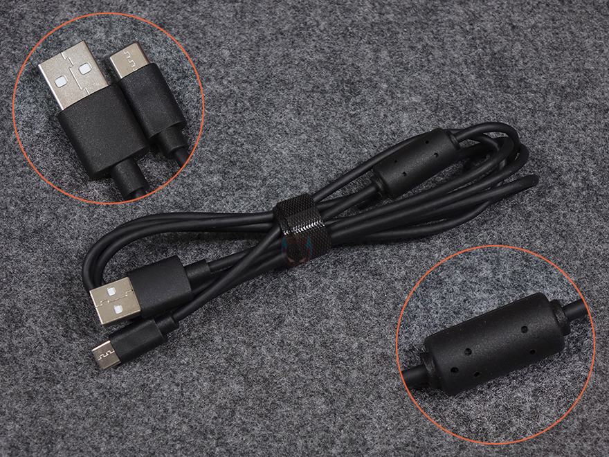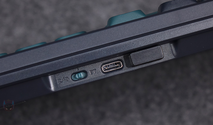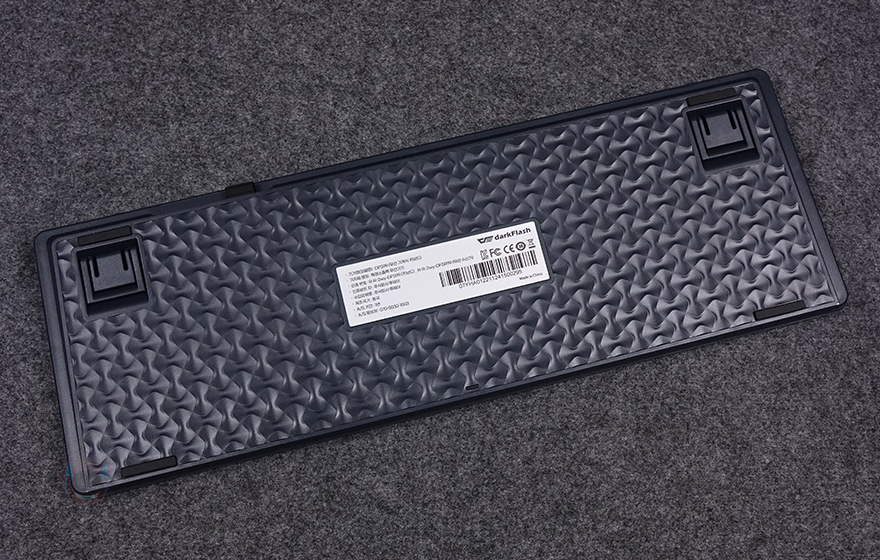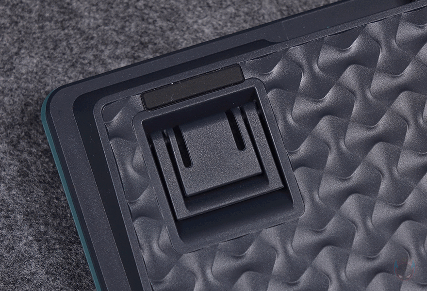 그리고, DFS99 키보드 전면 한쪽 정확히는 Delete 키 위치 전면에 유선시 사용되는 USB 전원 및 충전케이블과 연결되는 USB 타입 C 포트가 배치되어 있으며, 양쪽에 각각 블루투스/무선 2.4G 모드 스위치, 무선 2.4G 사용 시 이용되는 수신기가 수납되어 있습니다. 키보드 밑바닥 부분에는 입체감 있는 패턴 디자인을 적용했으며, 모서리 부근으로 미끄럼방지 패드가 부착되어 있으며, 앞쪽에는 2단 높낮이 받침대가 적용되어 있는데, 받침대에도 모두 패드가 부착되어 있습니다. 높낮이 조절이 가능하기 때문에, 측면에서 보면 충분히 높이에 따른 각도가 있어서, 사용자가 원하는 높이에서 설정해서 사용할 수 있죠. 끝으로, USB 전원 및 충전케이블은 1.5m 길이에 USB Type A to C 인터페이스를 가졌으며, 신호손실 최소화를 위해 노이즈 필터도 적용되어 있습니다.