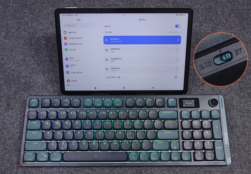 직접, 다크플래쉬 DFS99 키보드를 사용해보면, 일단 연결방식은 앞서 언급했듯이 유선, 무선 2.4G, 블루투스 3가지 모두 지원합니다. 유선은 제공되는 USB 전원 및 충전케이블을 사용해 PC와 키보드를 연결해주면 별도의 드라이버 설치없이 바로 사용이 가능하고, 무선 2.4G 역시 제공되는 수신기를 연결할 기기에 꽂고, 키보드 전면에 있는 연결모드 스위치를 2.4G로 선택하면 바로 연결되어 사용할 수 있습니다. 블루투스 같은경우에는 PC뿐만아니라 모바일기기도 연결 사용가능한데, 연결모드 스위치를 BT로 선택한 후, Fn+Q/W/E 중 하나를 선택해 3초이상 누르고 있으면 페어링모드가 시작되고, 연결할 기기에서 장치 검색을 통해 'DFS99 BT1/2/3' 중 선택한 디바이스를 찾으면 선택해서 연결해주면 됩니다. 참고로, 모바일기기와 연결해서 사용해도 Fn키 조합의 일부 부가 기능을 사용할 수 있으며, 다이얼 노브 같은경우에는 돌리면 볼륨조절, 버튼처럼 누르면 음소거 On/Off를 할 수 있습니다.
