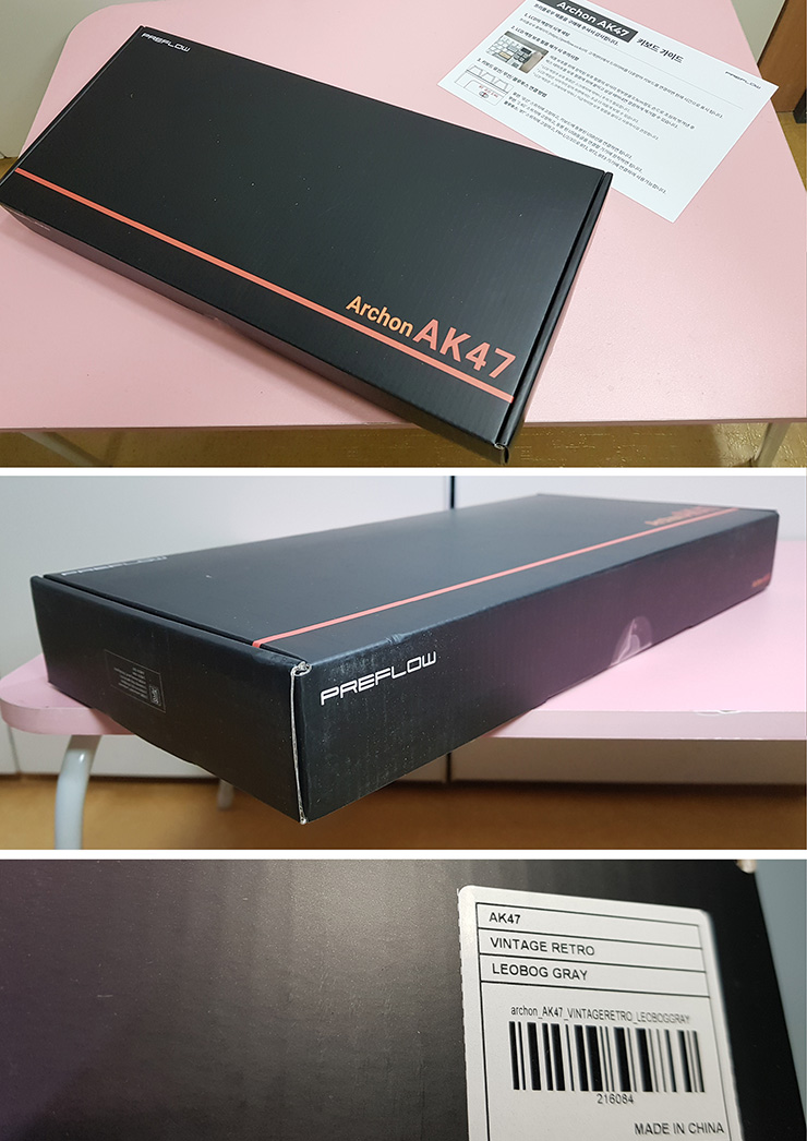 굉장히 단순한 디자인의 박스다. 후면에 부착된 작은 스티커를 통해 필자가 받은 제품은 빈티지 레트로 컬러 키캡에 회목축 (LEOBOG GREY)키캡이 탑재된 제품임을 확인할 수 있다.