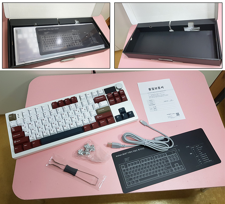 박스 속 내용물은 리무버, 더스트 커버, 유선 연결용 케이블, USB리시버, 품질 보증서, 추가 스위치, 퀵 가이드, 투명 플라스틱 키보드 덮개로 구성되어 있다.