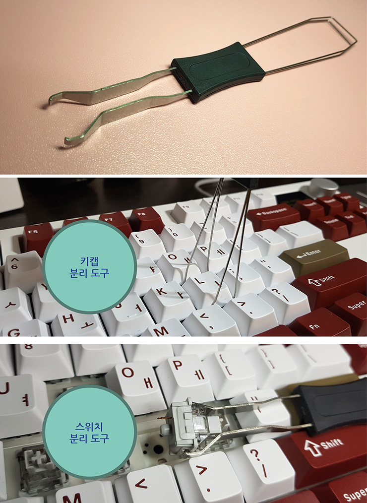 리무버는 키캡과 스위치를 모두 분리할 수 있는 독특한 제품이다. 뾰족한 집게로는 스위치를 적출할 수 있고 사각 집게로는 키캡을 탈거할 수 있다.