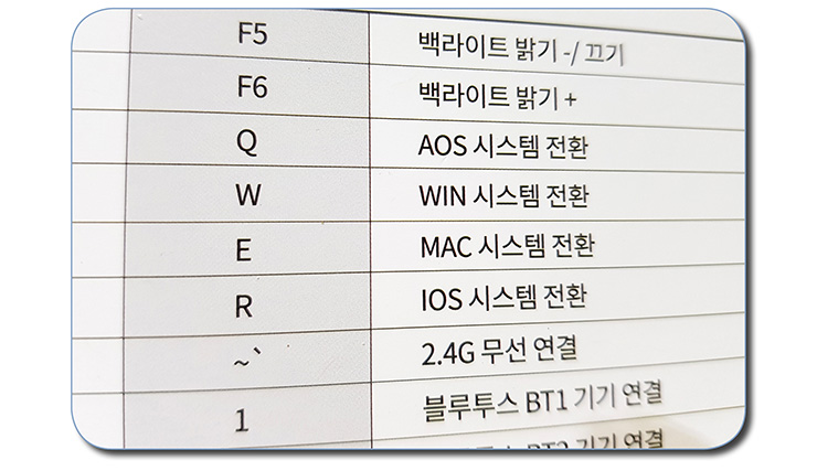 이 제품은 FN+QWER키를 눌러 연결 기기에 맞게 작동 방식을 바꿀 수 있다. 그런데 WIN, IOS, MAC는 바로 알겠는데 AOS는 뭘까? 설마 롤같은 AOS 게임 전용 모드가 존재하는 걸까? AOS에 대한 정확한 설명은 없지만 정황상 ANDROID OS의 줄임말로 보인다.