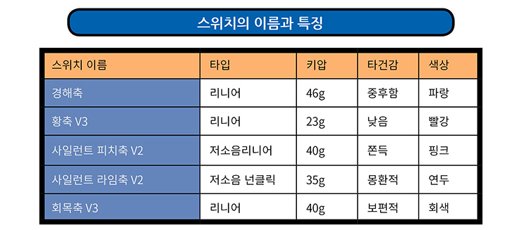 다섯가치 스위치의 이름은 각각 경해축 (SWK SEAWHALE SW), 황축V3 (LEOBOG YELLOW SW V3), 사일런트 피치축 V2 (OUTEMU SILENT PEACH SW V2), 사일런트 라임축 V2 (OUTEMU SILENT LIME SW V2), 회목축 V3 (LEOBOG GREY SW V3)이며 모두 사전윤활이 적용되어 있어 따로 작업하지 않아도 최상의 컨디션을 구사한다.