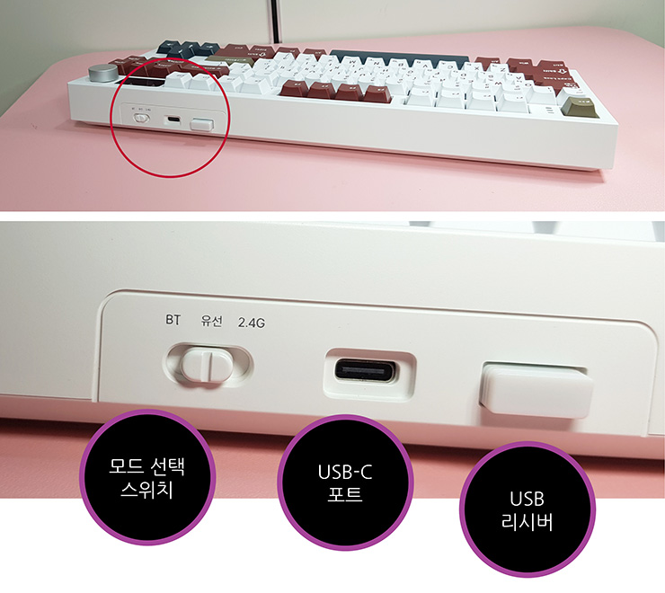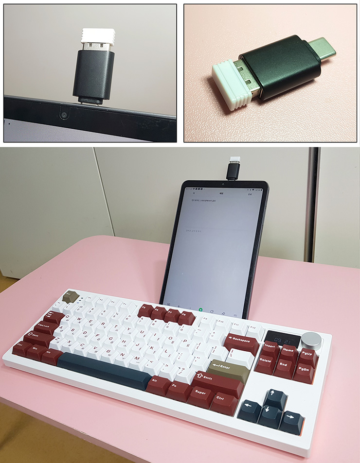 OTG 젠더가 있다면 스마트폰에서도 2.4G 무선 방식으로 키보드를 쓸 수 있다. 필자의 경험상 스마트폰에서 키보드를 장시간 사용할 때는 블루투스 모드가 낫고 급작스럽게 스마트폰에 키보드를 연결해 써야 할 때는 2.4G 무선 방식이 더 나은 것 같다.