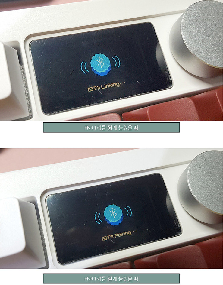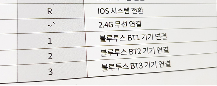 페어링 모드로 들어가려면 BT 선택키를 길게 누르면 된다. 예컨대, BT1 페어링 모드 시 FN+1번키를 길게 누르면 되고 BT2 페어링 모드 진입 시 FN+2키를 길게 누르면 된다.