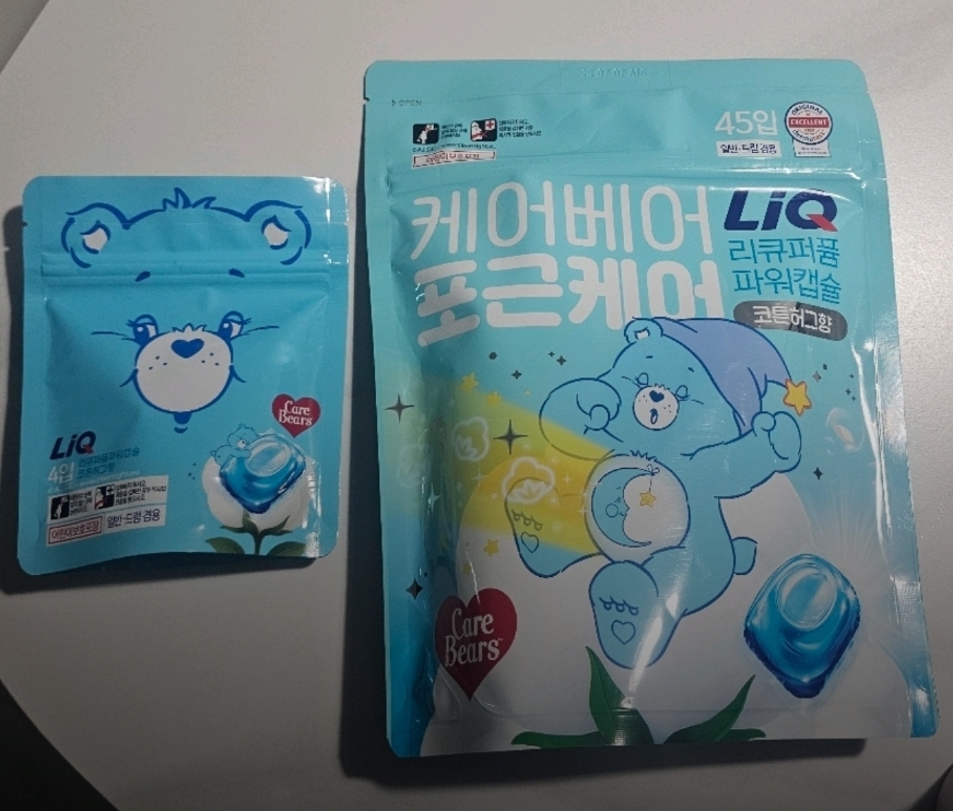 이번에 케어베어 콜라보로 출시된 캡슐세제를 사용해봤어요. 보자마자 심쿵하는 귀여운 패키지 좀 보세요!  케어베어 캐릭터와 포근한 코튼향이 정말 잘 어울려서 사용할 때마다 기분이 좋아진답니다.