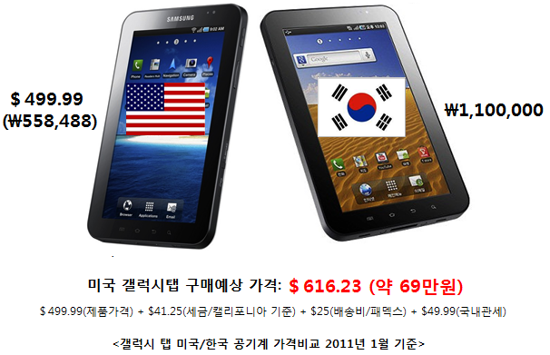국내의 갤럭시탭은 미국에 비해 2배 가까운 가격입니다. 물론 미국에서 판매되는 갤럭시 탭에는 지상파 DMB'가