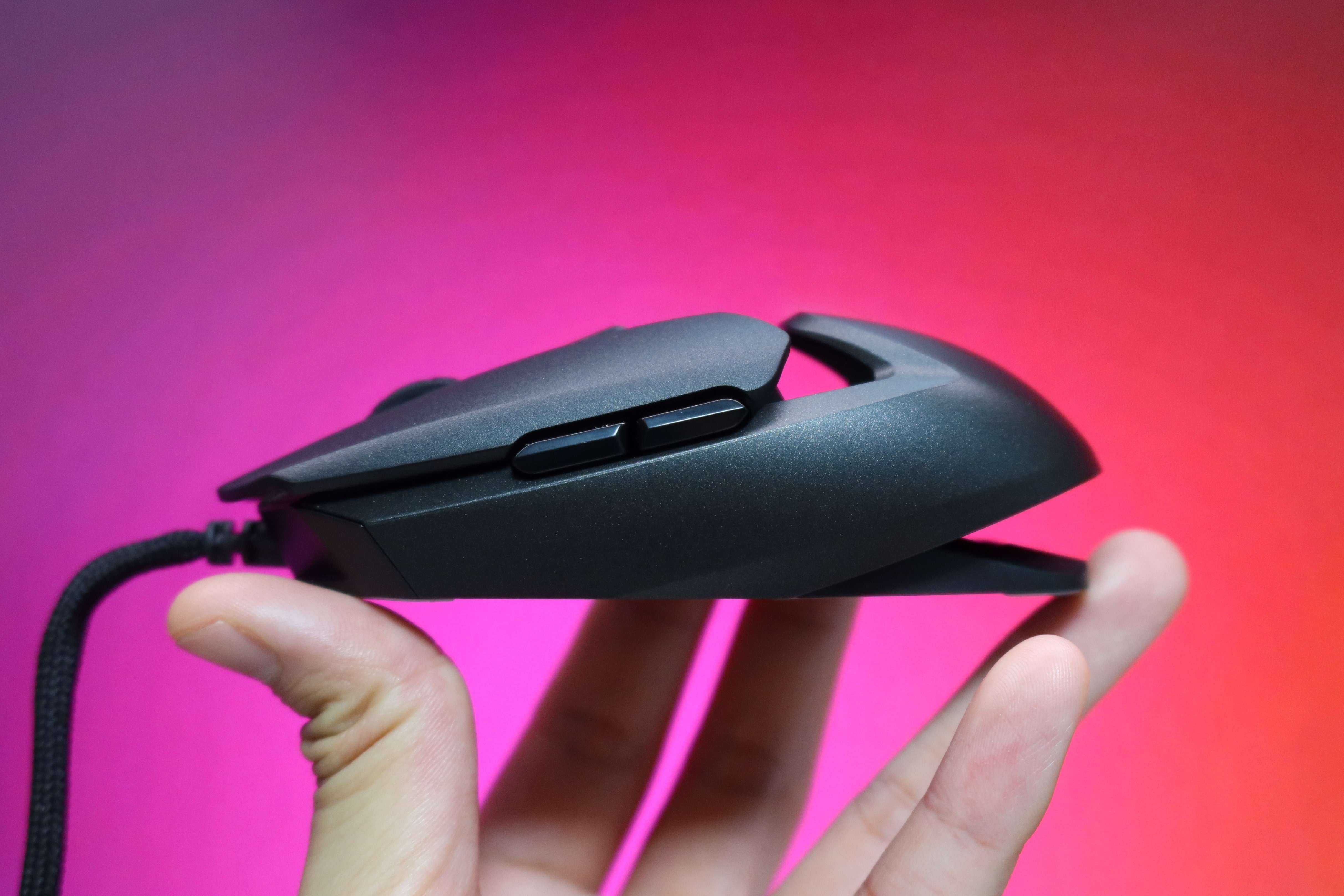 마우스 크기는 117 x 62.8 x 37.8 mm 사이즈로 컴팩트한 느낌이 듭니다.  손사이즈 F10인 제가 클로우 그립으로 사용했을때 기존 마우스보다 살짝 작다는 느낌이 듭니다. 하지만 뒤쪽 엉덩이 부분이 볼륨감 있어 밸런스가 좋습니다.  버튼은 총 6개의 버튼으로 좌클릭, 우클릭, 마우스휠버튼, DPI 버튼, 포워드, 백워드 버튼이 있습니다.