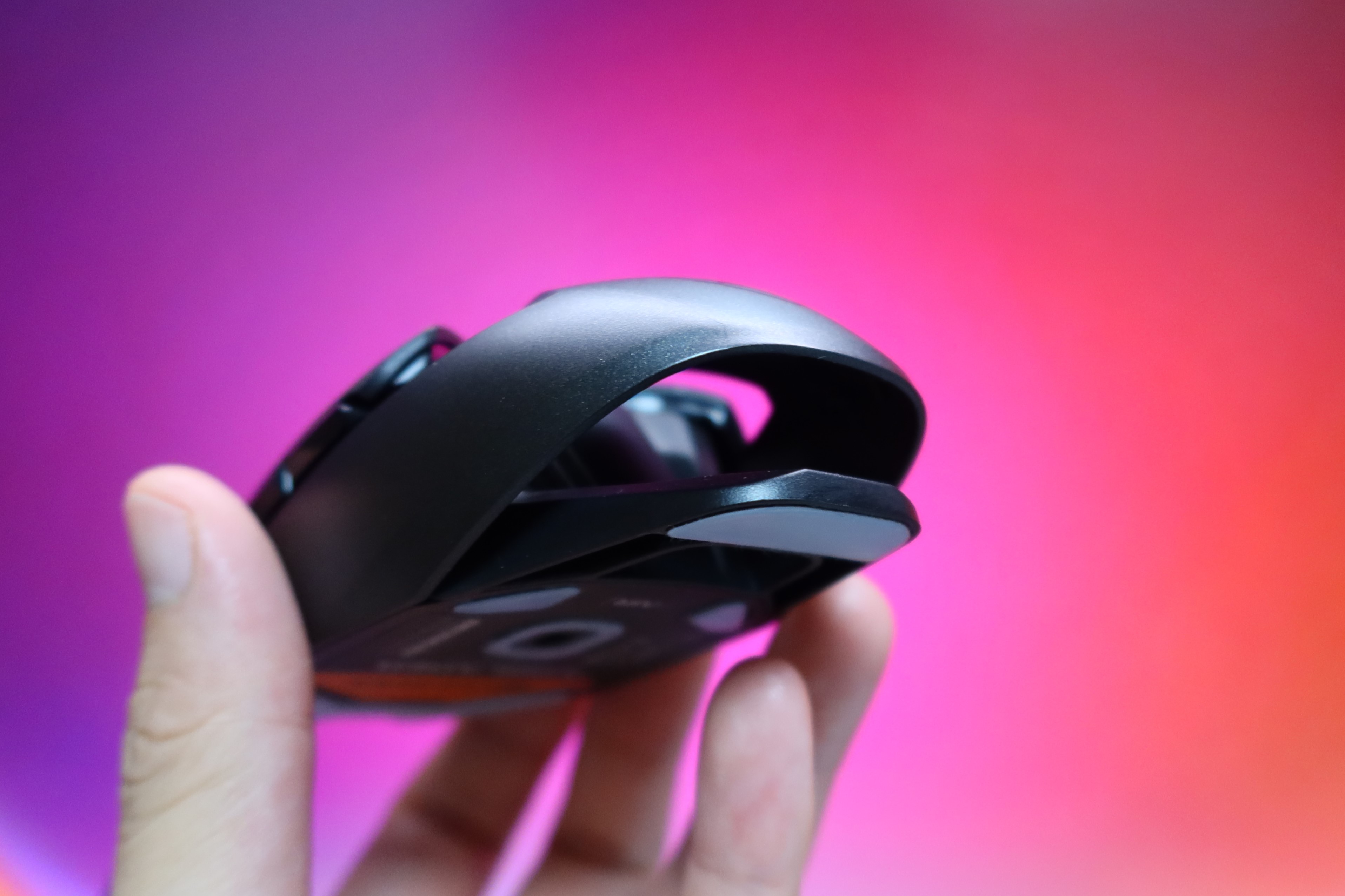 하단부에 마우스피트는 넓고 앞뒤 좌우로 부착되어 있습니다. 버진 등급 PTFE 스케이트로 되어있어 적은 마찰로 편안하고 부드럽게 마우스를 컨트롤 할수 있습니다. 실제 사용할때 에어블레이더 라는 네이밍에 걸맞게 슥샥슥샥 쓰기 좋습니다.