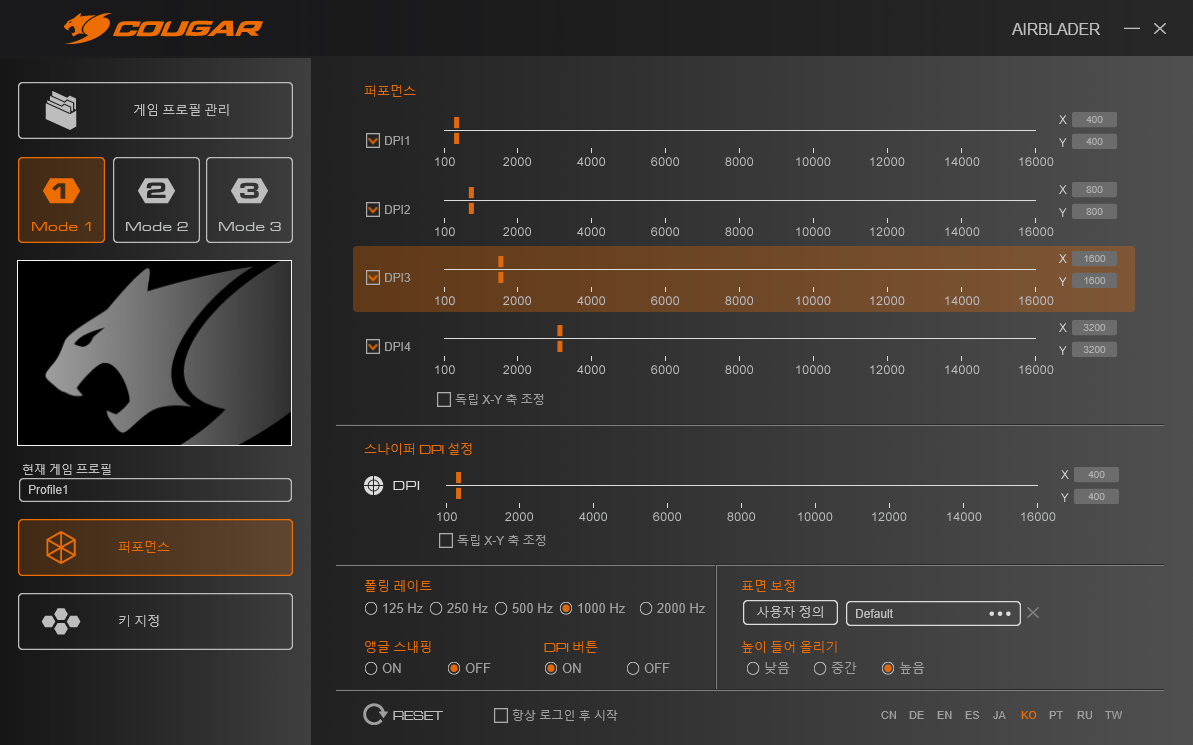 프로그램을 설치하면 마우스의 DPI나 플링 레이트를 설정 가능합니다. 프로필도 여러개 생성할수 있어 플레이하는 게임에 맞게 추가 가능합니다.