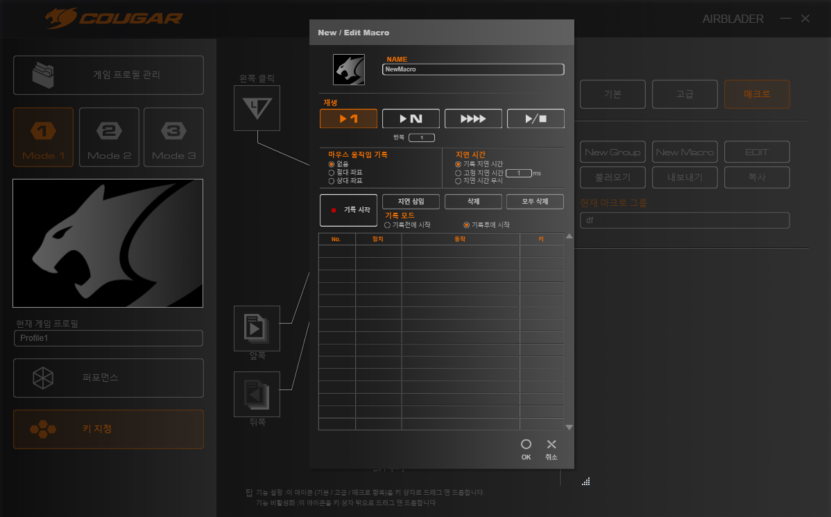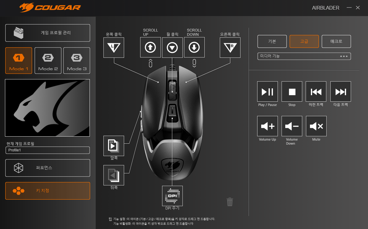 마우스버튼도 기본 설정값에서 내가 원하는 버튼으로 바꿀수 있고 음량조절이나 다양한 버튼으로 변경 할수 있습니다. 마우스 매크로기능도 제공해서 매크로를 저장후 버튼만 누르면 해당 매크로 기능이 작동합니다.