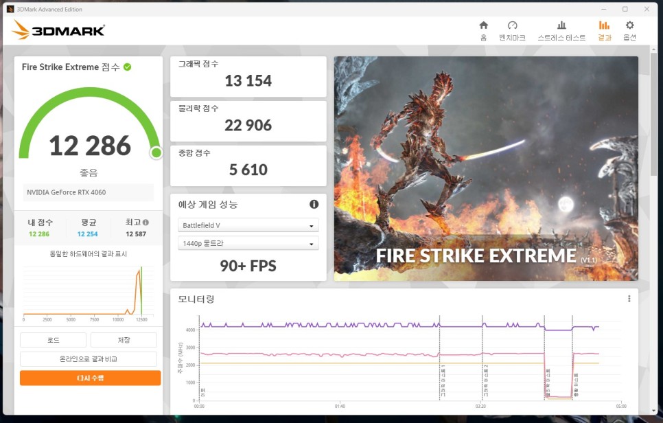 PC 사양을 말씀드리면 인텔 12세대 I5-12400F, DDR4 8GB X2, 파워 850W, SSD M.2 P41 1TB로 진행을 했습니다. 점수는 12286으로 준수하게 점수가 나왔고 평균보다 아주 살짝 높게 나왔습니다.