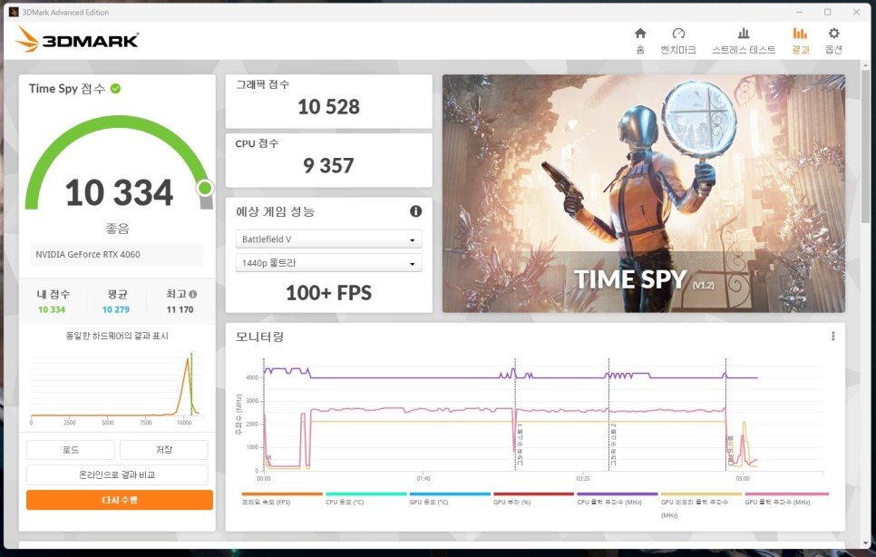 다음은 게임용 다이렉트x 12인 Time Spy를 진행했습니다. 점수는 10334점으로 역시 평균보다 아주 살짝 높게 나왔습니다. 만족스럽네요.