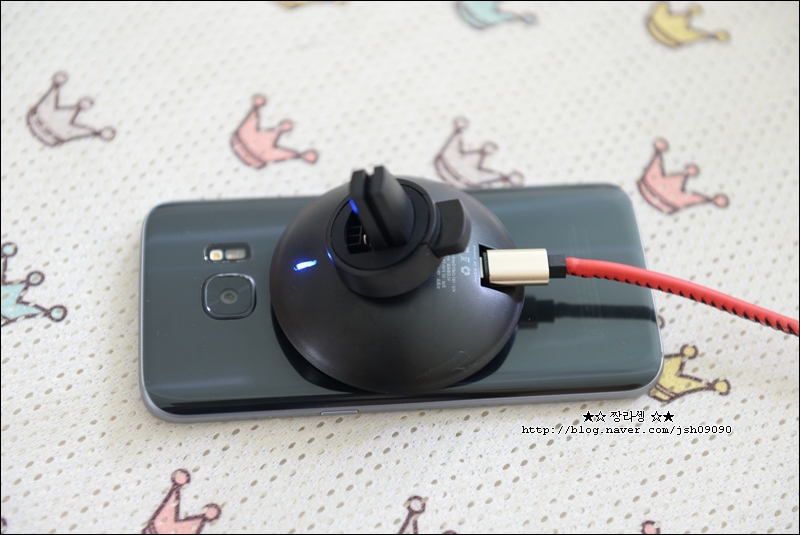 무선충전이 가능한 스마트폰에 대보니 충전되고 있다는 표시인 파란색 LED가 들어오네요~오~~