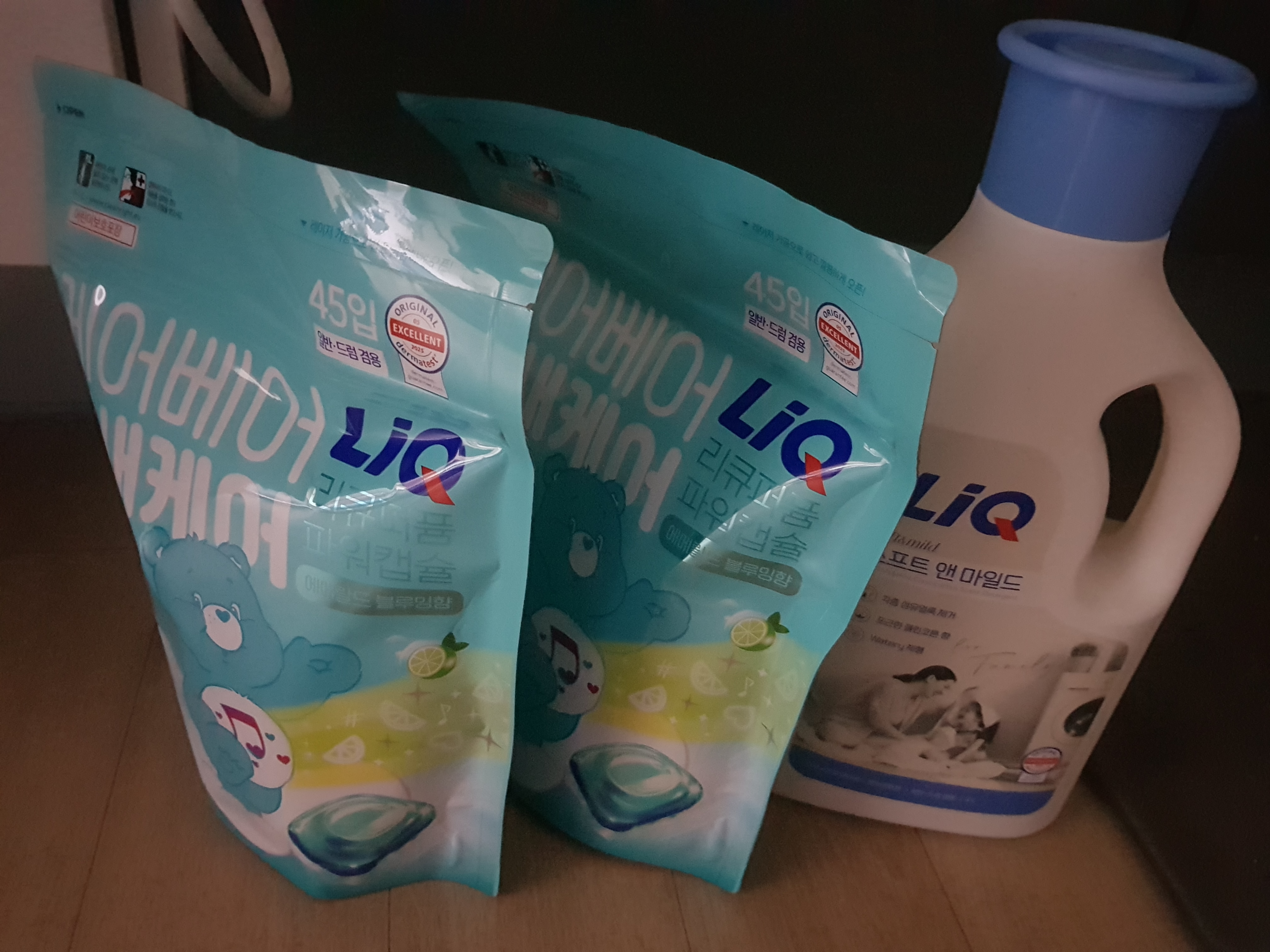 바로 **LIQ 소프트 앤 마일드 세탁세제**와 요즘 가장 핫한 **LIQ 클린코튼향 올인원 케어베어 코튼향 캡슐세제**입니다!